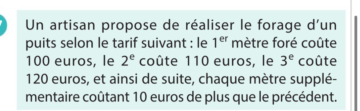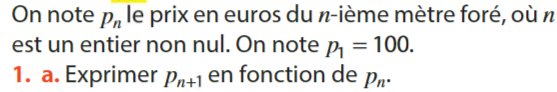On te dit dans l'énoncé que chaque mètre supplémentaire coute 10€ de plus que le précédent donc tu as \(p_{n+1}=p_n+10\)