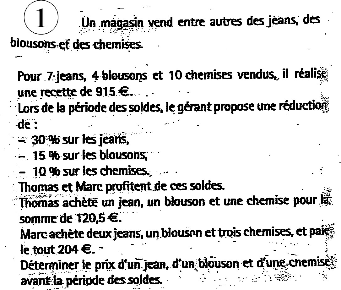 Je ne comprend pas comment vous passé de a - 30a/100 à 0,7a en simplifiant :s- On va simplifier un peu, le prix du jean après les soldes est bien a - 30a/100, simplifie en écrivant 0,7a, simplifie de même le prix de la chemise et celui du blouson.