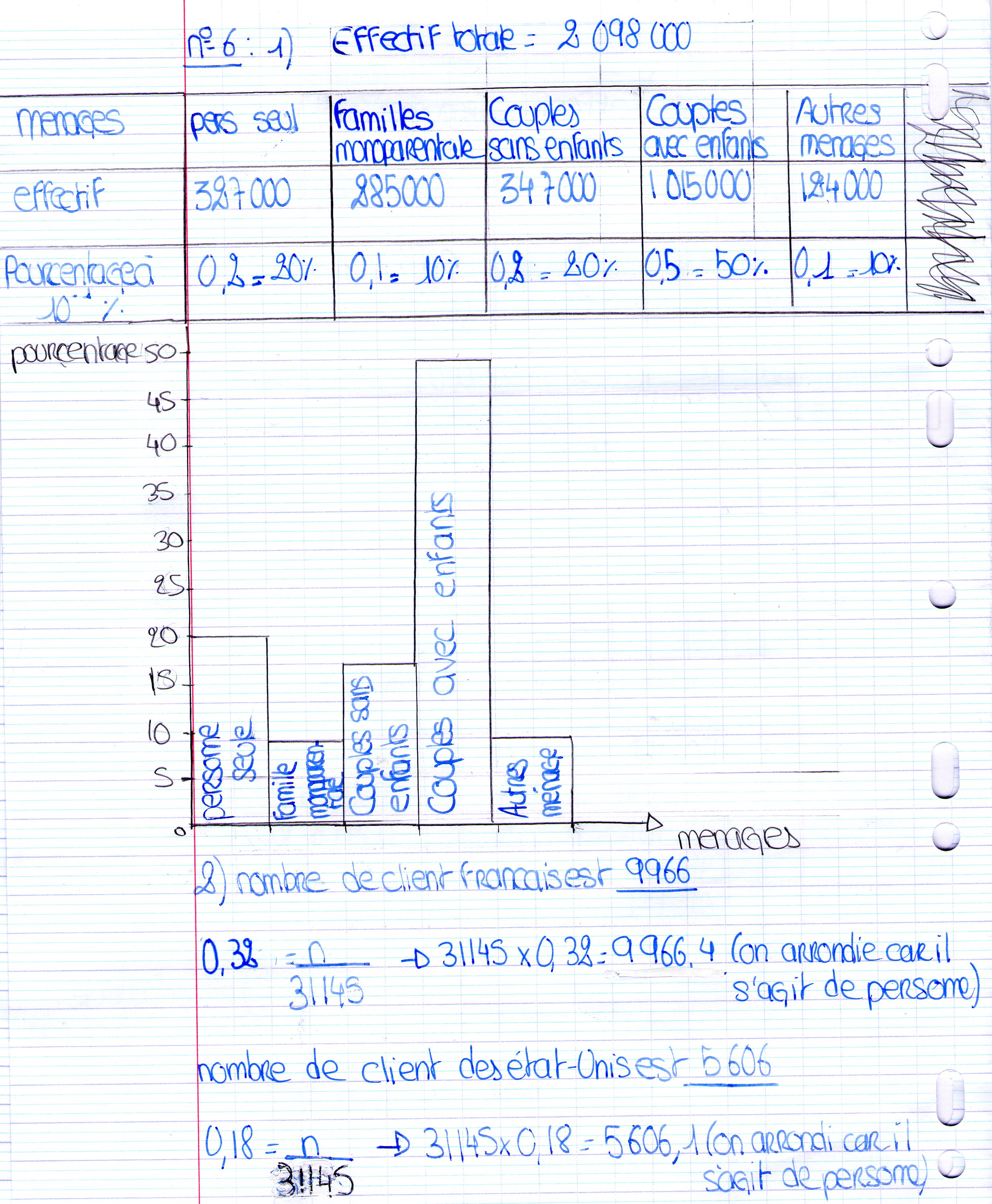 Le premier exercice me semble correct même si je pense que le diagramme en barres se réfère au problème de l'hôtelier et si tes calculs de pourcentages dans la première partie de l'exercice sont un peu violents.