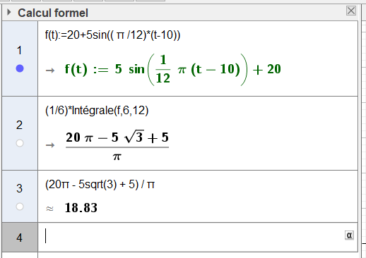 Si on prend \(f(t)=20+5\sin\left(\dfrac{\pi}{12}(t-10)\right)\), alors la valeur moyenne de \(f\) sur \([6\,;\,12]\) est bien égale à 18,83 :
