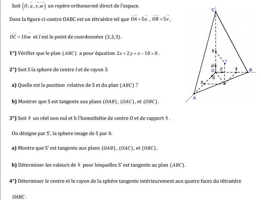 Un vecteur directeur de (OI) est \(\overrightarrow{OI}\) de coordonnées (3;3;3;) et le point O(0;0;0) appartient à la droite (OI) donc une équation paramétrique de (OI) est x = 3alpha y=3alpha z = 3alpha avec alpha le paramètre.