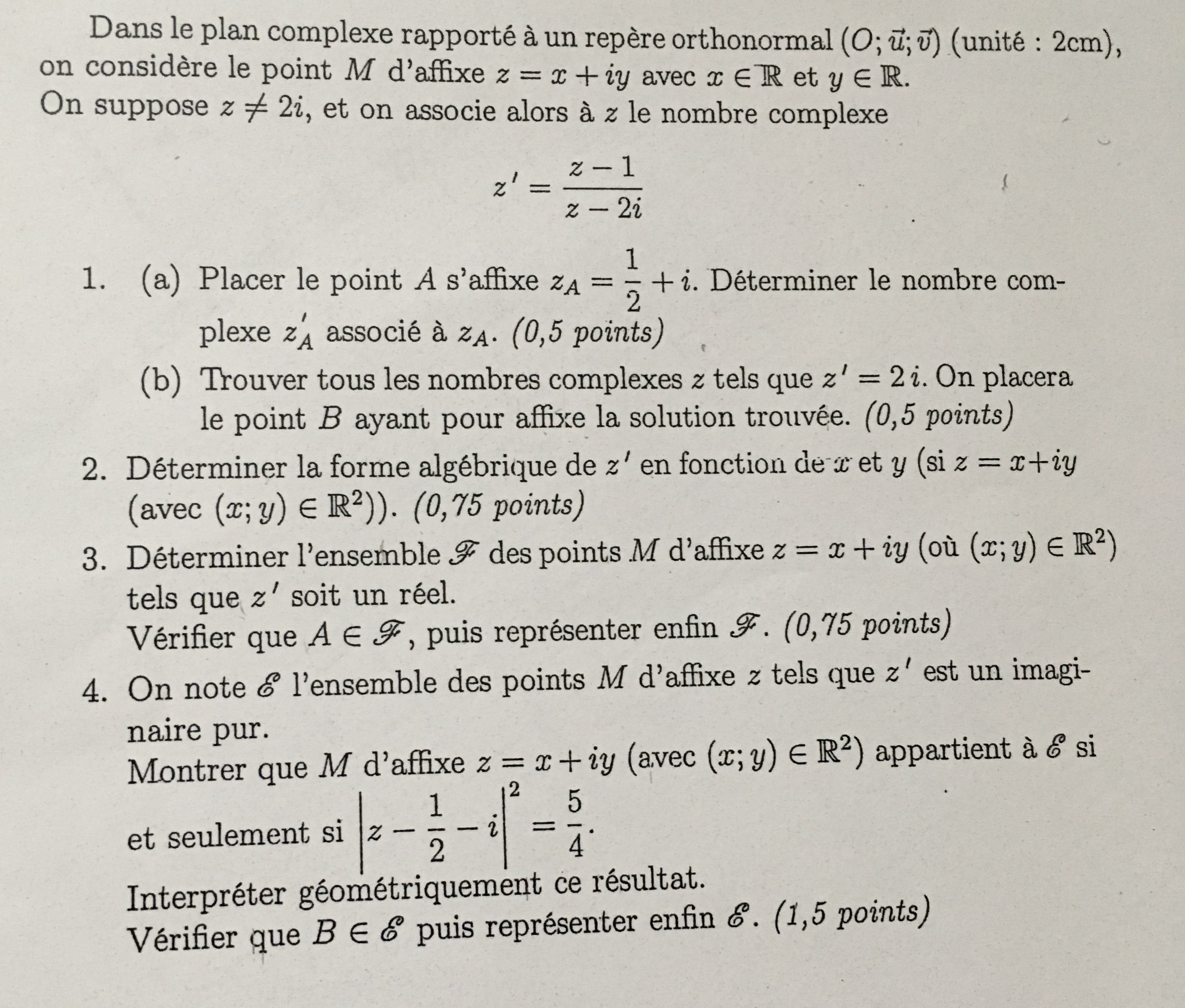pour la question 4 je trouve que l'ensemble cherché est le cercle de centre A(1/2; 2) et de rayon V5/2