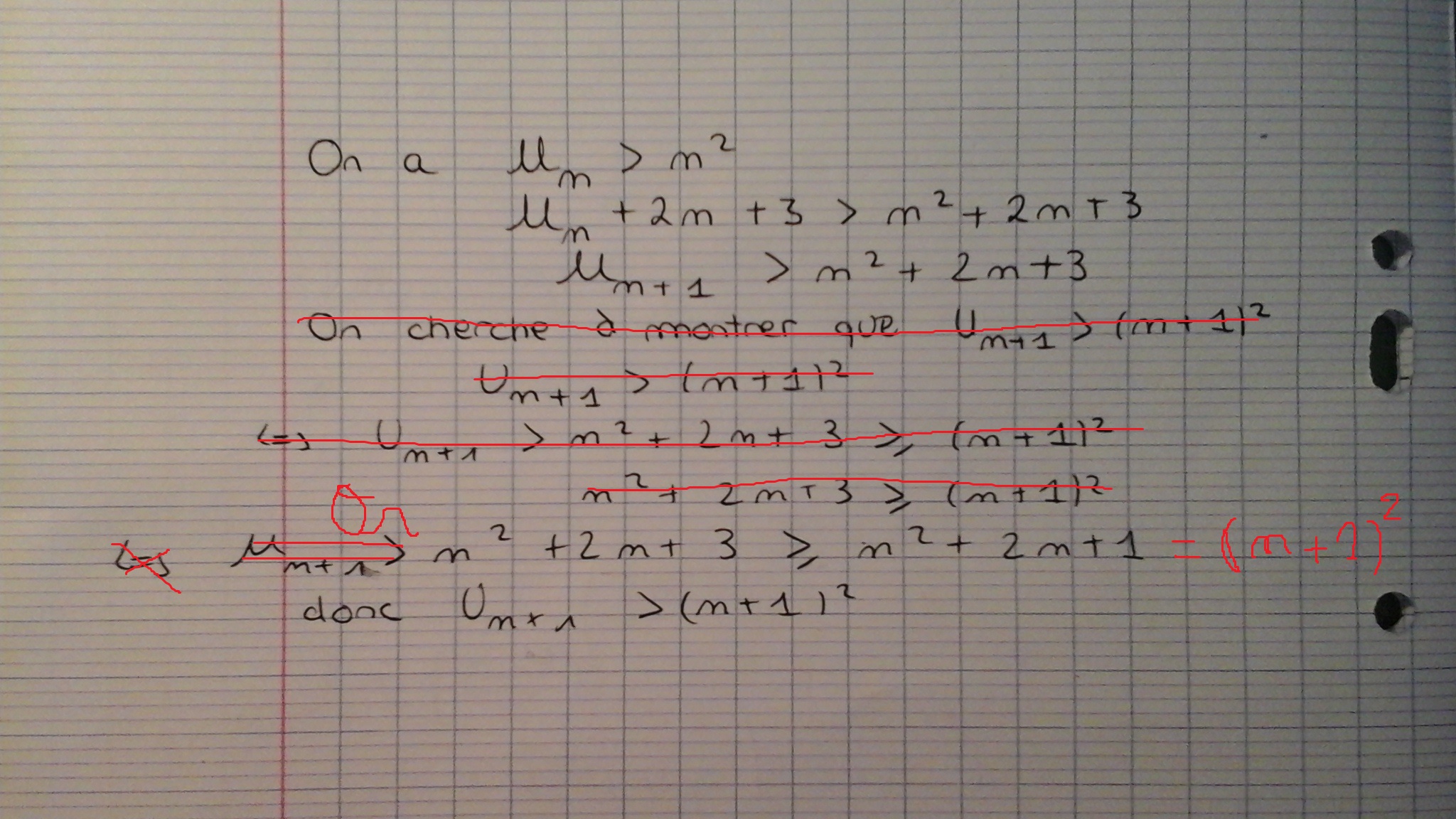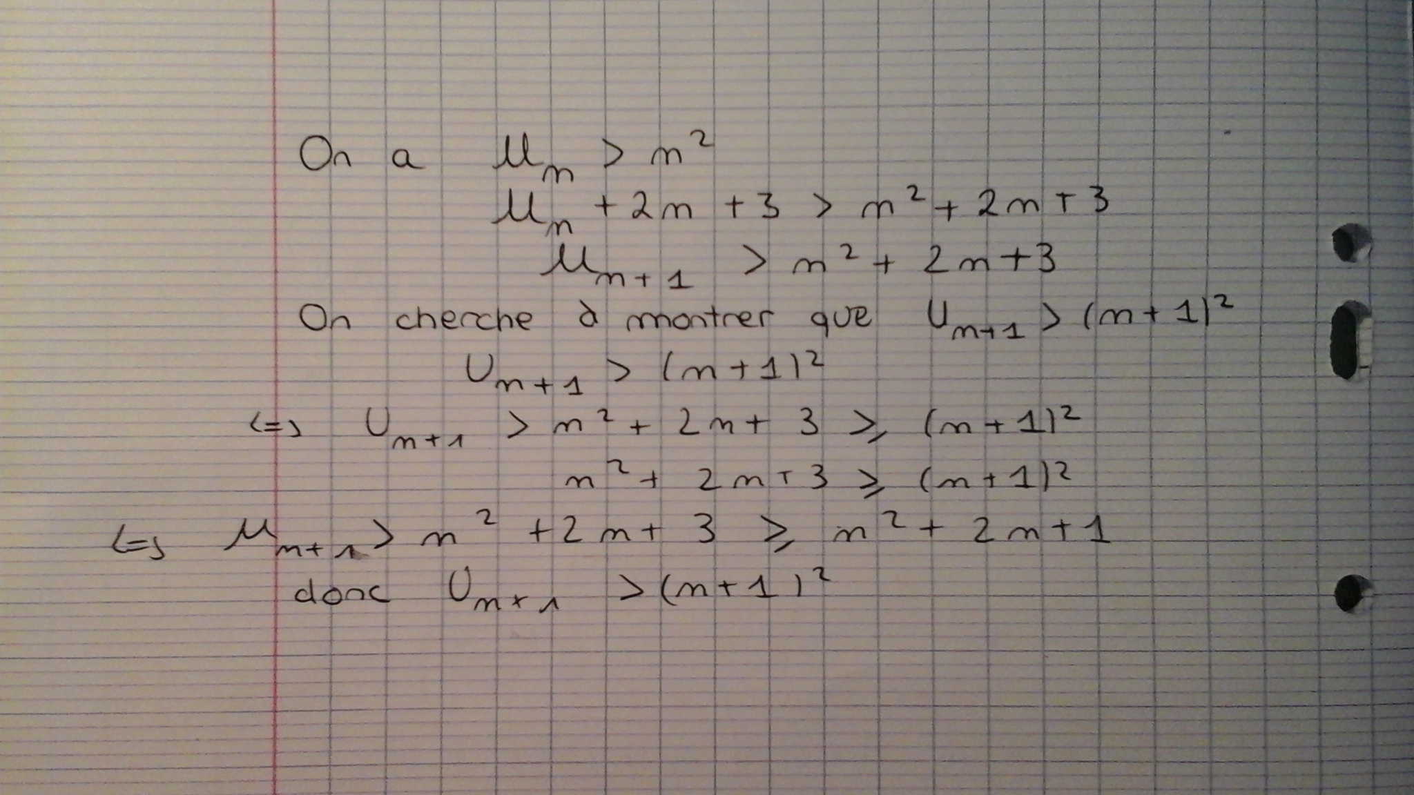 Tu as (par hypothèse) : \(U_n > n^2\) et donc, effectivement, \(U_{n+1} > n^2 +2n + 3\)