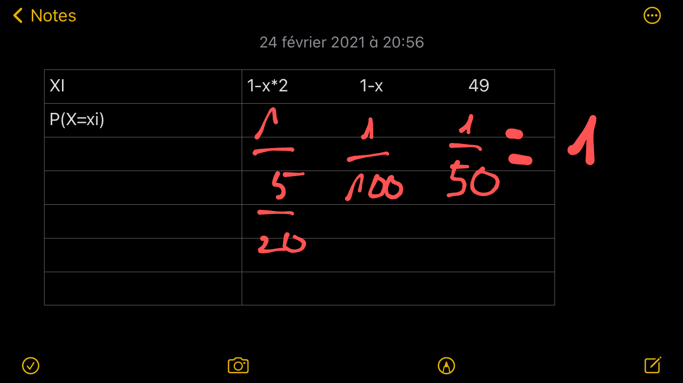 Pour la question 1 petit b comme c’est l’espérance on fait \(E(x)=(-x^{2}-1 \times 0,64)+(x-1 \times0,32)+(49\times 0,04)= (-x^{2}-0,64)+(x-0,32)-1,96=-x ^{2}+x-0,64-0,32+1,96= x^{2}-x+1\)