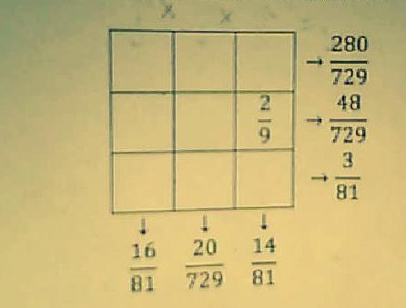 Les produits sur les 3 lignes sont 280/729 ; 48/729 ; 27/729