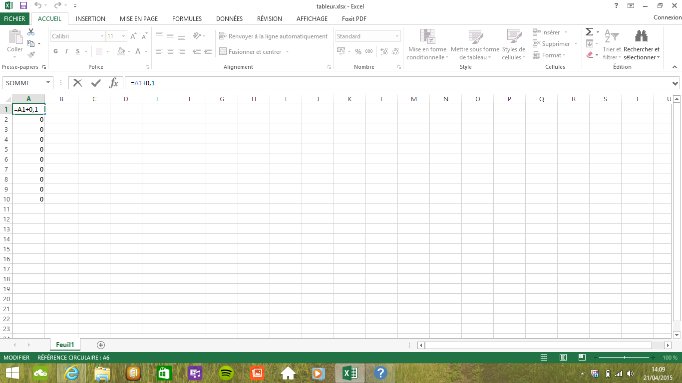 la valeur ne change pas quand j'étire la colonne , ma formule est la suivant \(fx=A1+0,1\)