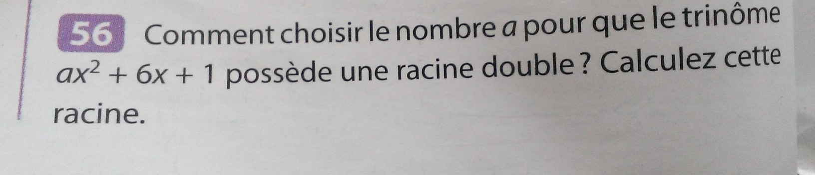 Pour le 56, calcule le discriminant (en fonction de a). (Pour une racine double, il faut que le discriminant soit égal à ...)