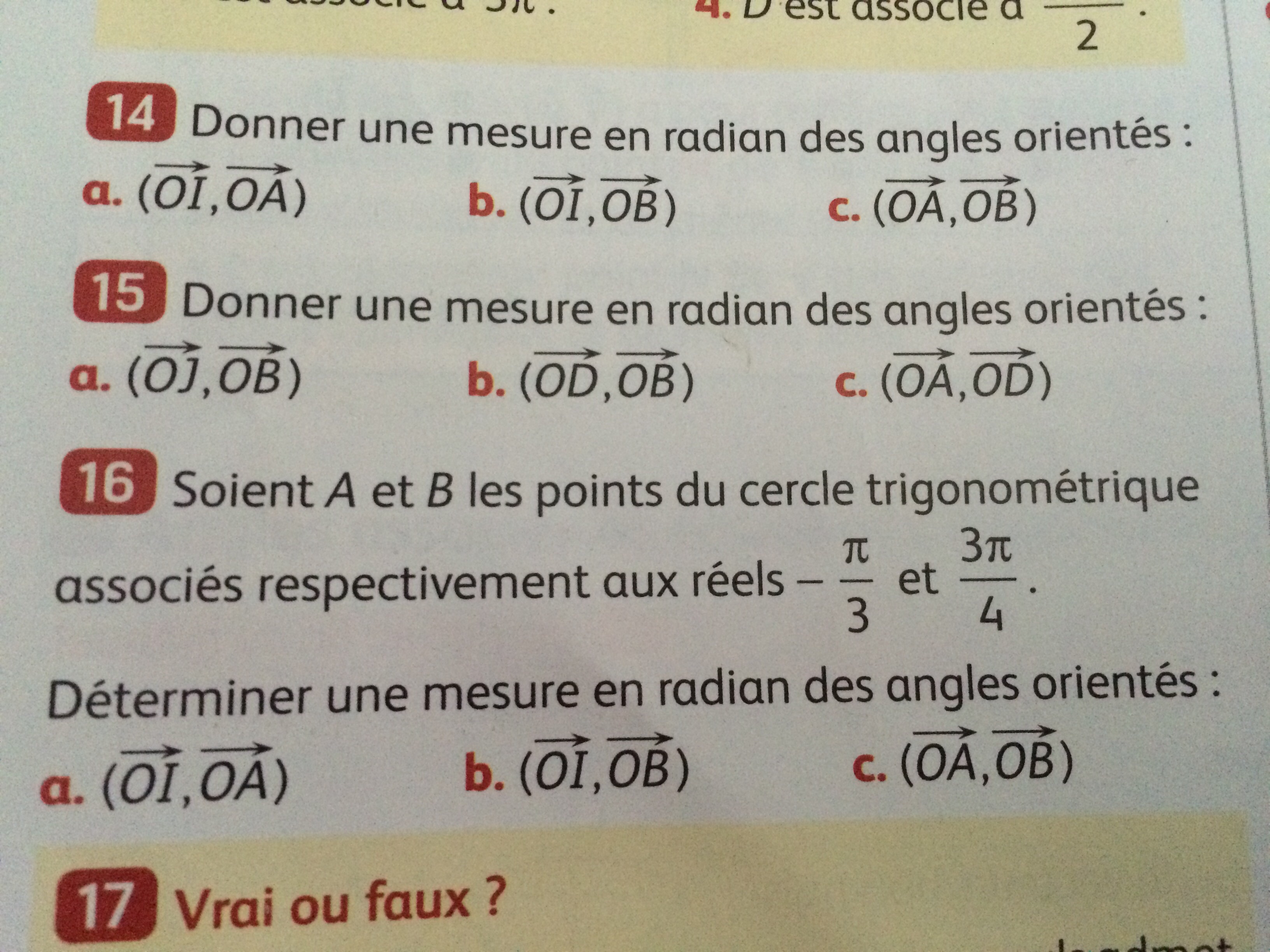 15. a: π/4 b. -3π/4 c. 7π/6