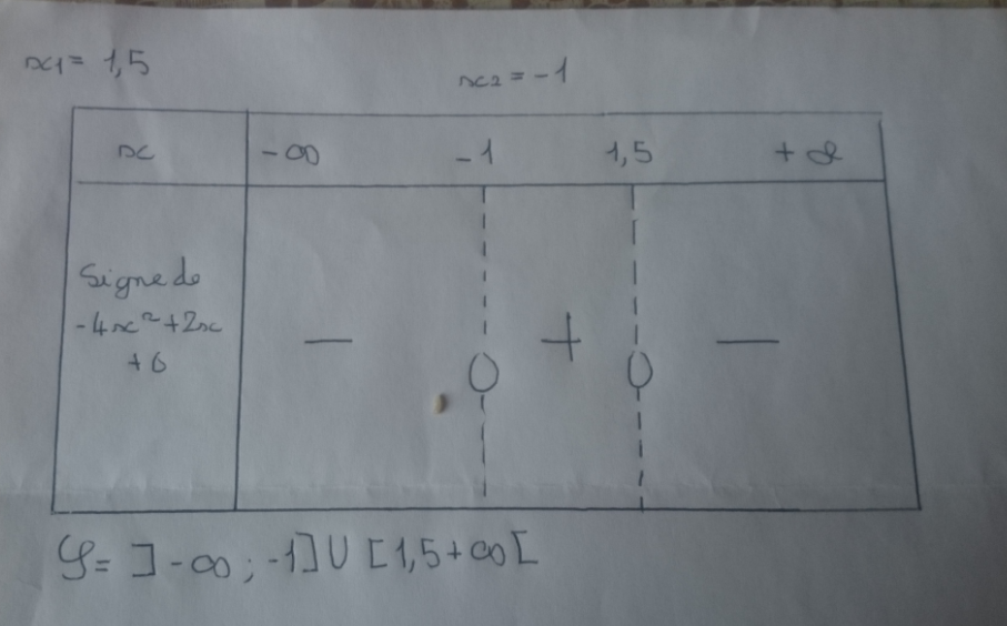 Après votre remarque j'ai donc fait un tableau de signes avec x1 et x2 que j'avais calculé à la question précedente: