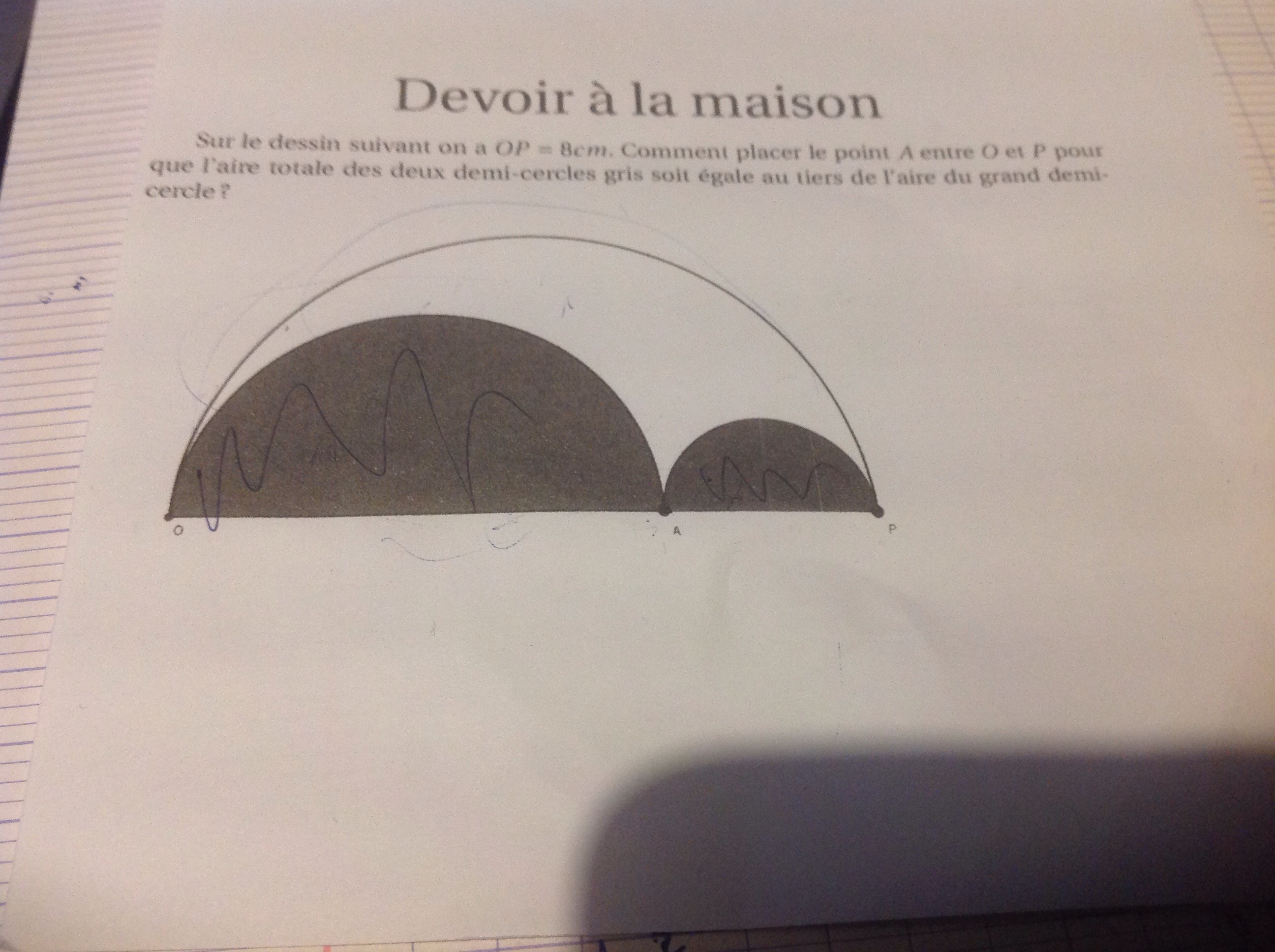 Bonjour a tous je suis en 1erS Svt et j'ai Devoir maison qui me pose vraiment problème j'ai essayer d'appliquer tout ce que je savais mais en vain, c'est un demi cercle de diamètre OP=8cm et à l'intérieur il y deux autres demi cercles OA et AP et la question est qu'elle est la position de A tels que l'air des deux demi cercles intérieur soit égal au tiers de l'air du demi cercle OP