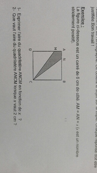 du coup la réponse est aire ANCM = (X x X)/2 = X au carré/2
