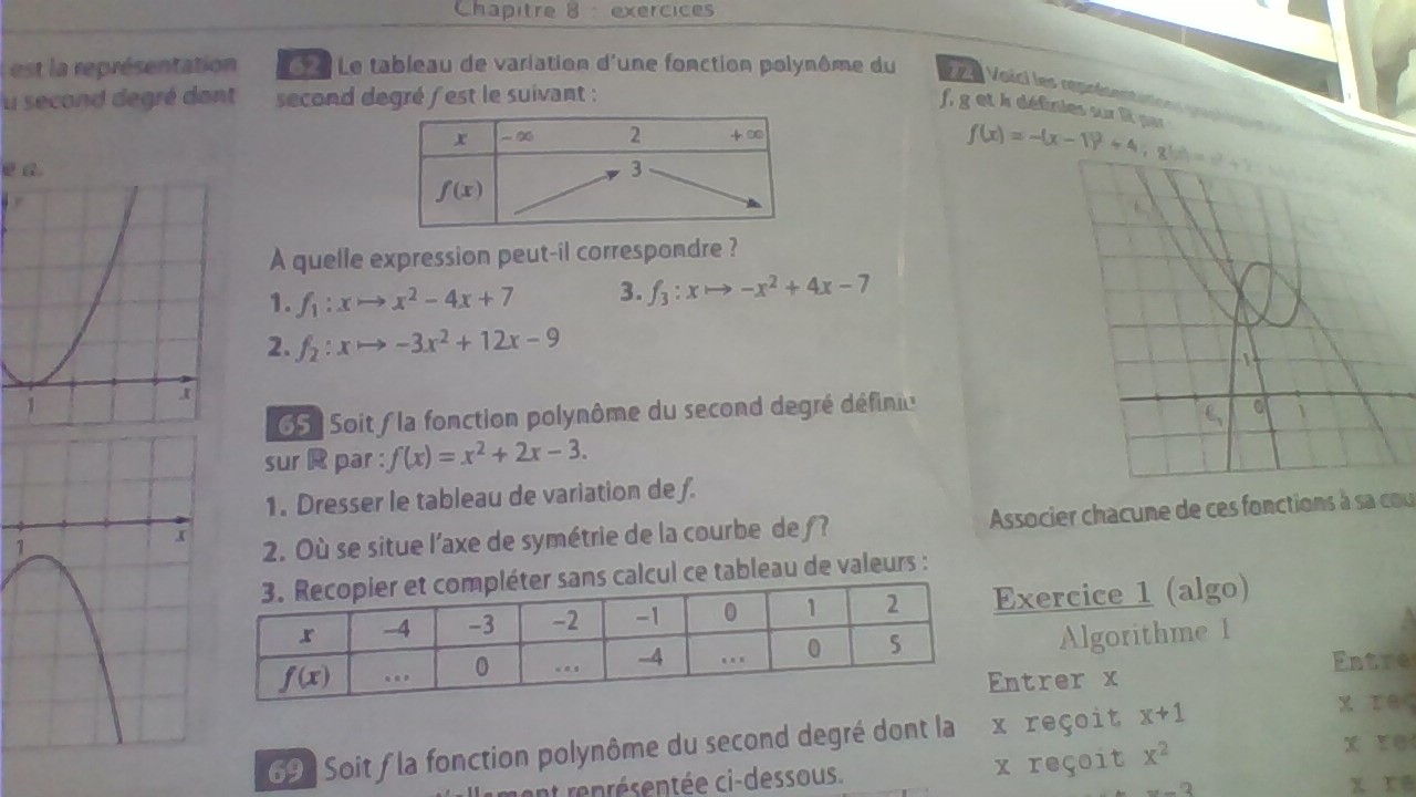 Pour le 65 tu as une fonction polynôme du second degré : ax²+bx+c avec a>0 donc elle est décroissante puis croissante , à toi de poursuivre