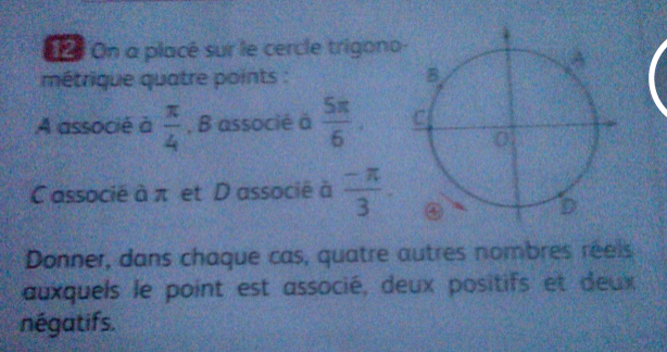 Pour le n°11, les réels x et y sont repérés par le même point M si (x - y) correspond à un certain nombre de tours de cercles donc que c'est un multiple de 2pi.