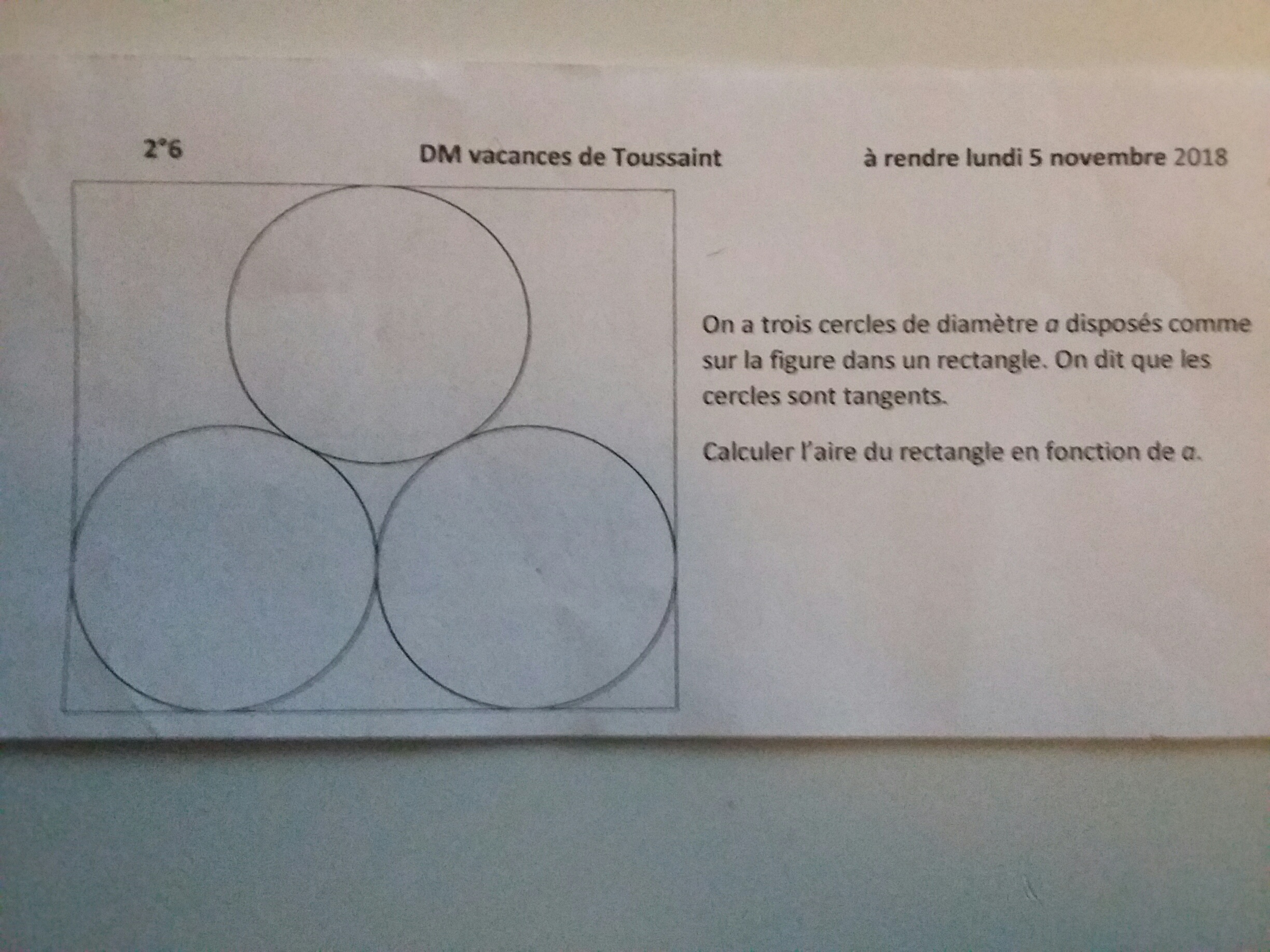 Ensuite, il te faut tracer le triangle formé par les trois centres : ce triangle est équilatéral de longueur \(a\), il te faudra calculer la hauteur de ce triangle \(OH_3\). Bonne continuation