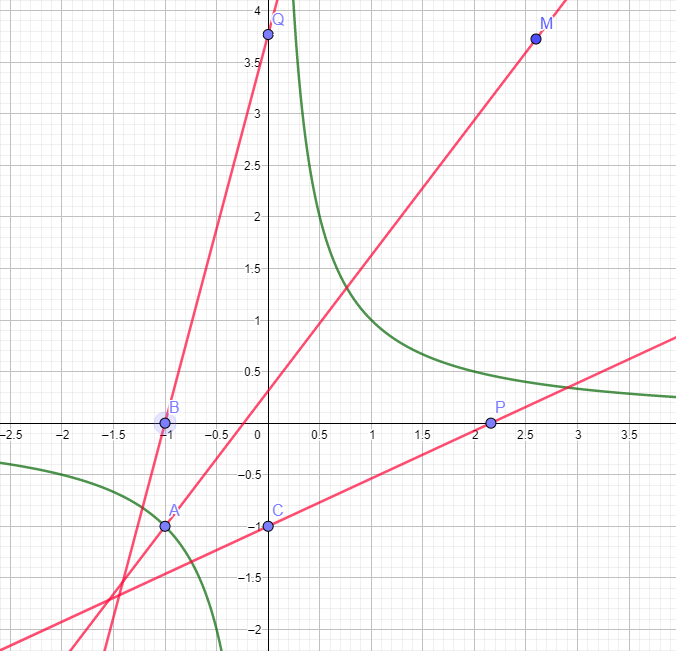 Dans un repère orthonormé (0;\vec{i},\vec{j}), on donne les points A(-1;-1), B(-1;0) et C (0;-1) C 1 set la courbe d"équation 1/x. M est un point quelconque . M se projette orthogonalement en P sur l'axe des abscisses et en Q sur l'axe des ordonnées du plan.