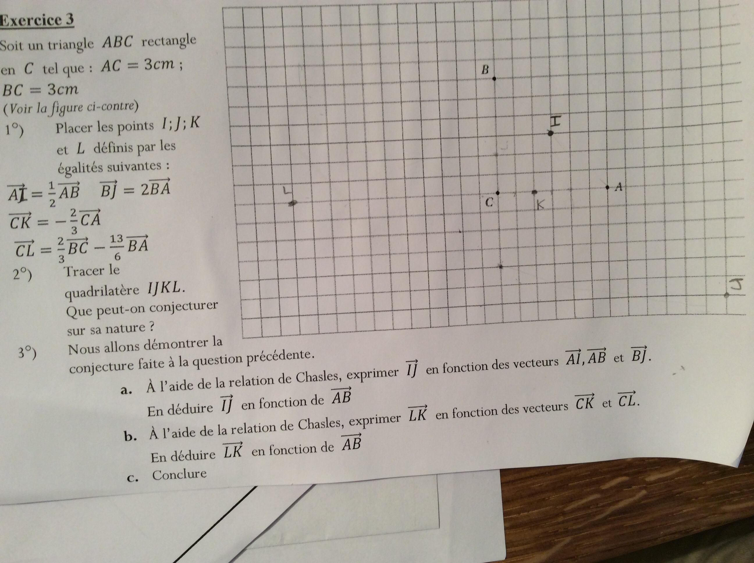 Les points I et J sont correctement placés. Le point K n'est pas bon. Pour les points K et L, reprends l'égalité et fais bien attention au point d'origine du vecteur.