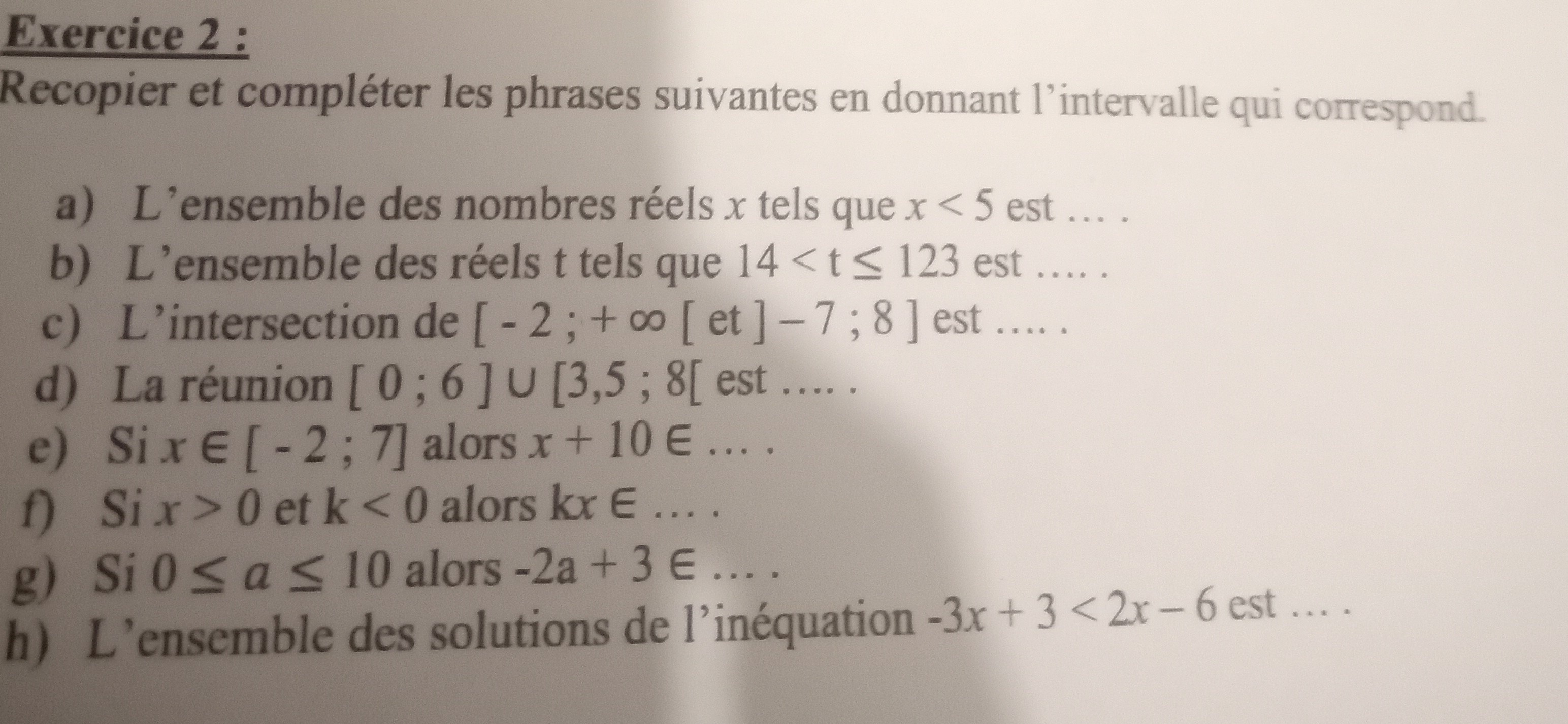 Je te donne cependant la réponse pour la première question \(x \in ]-\infty~;~5[\), à toi de faire de même pour les autres.