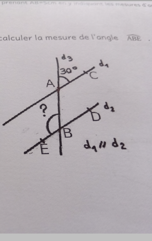 Tes droites sont parallèles donc tu vas avoir des angles correspondants : \(\widehat{CAd_3}\) (qui mesure 30°) et l'angle \(\widehat{DBA}\) sont correspondants donc ils ont la même mesure et \(\widehat{DBA}\) mesure 30°.