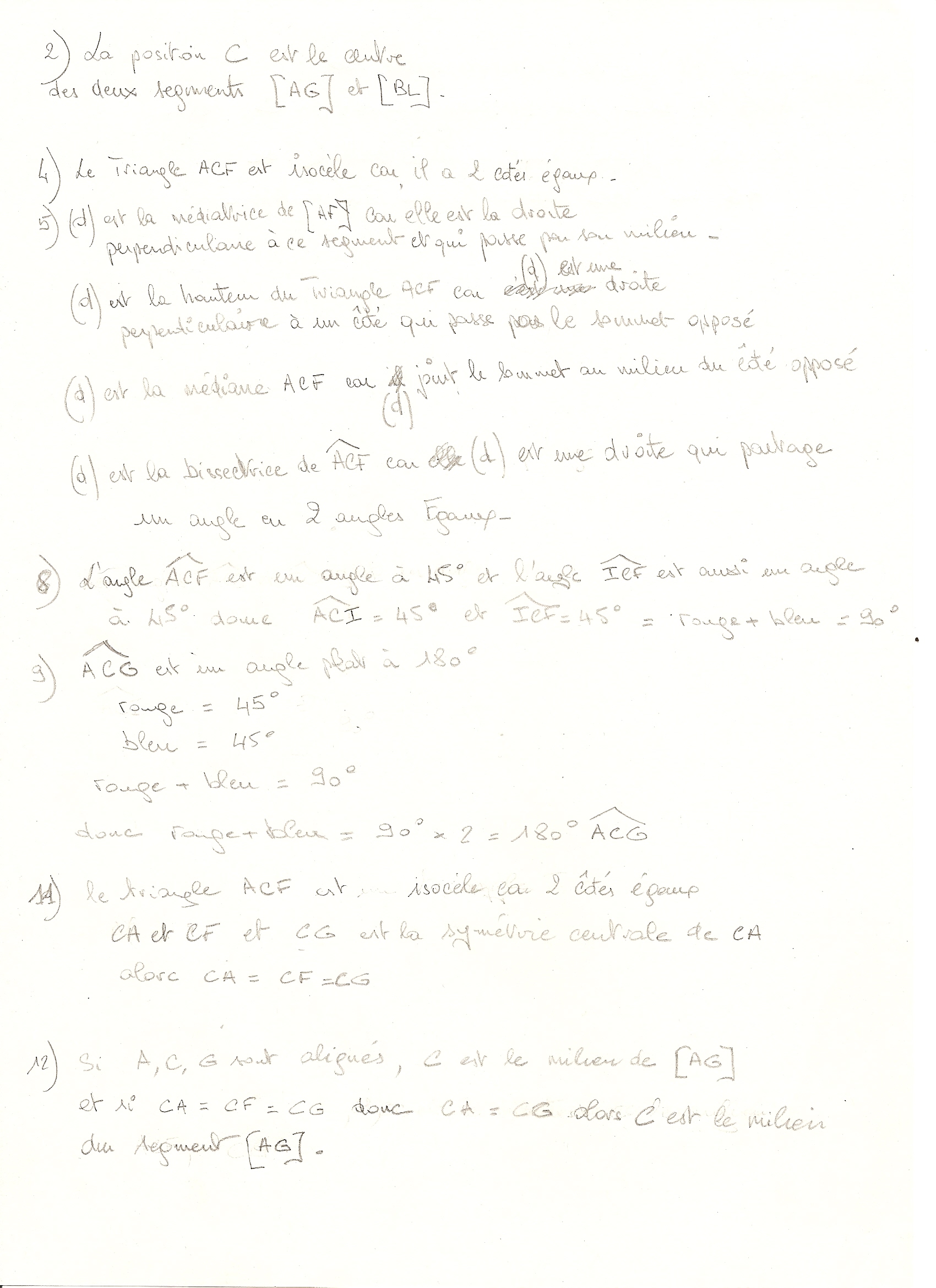 Ensuite, lorsqu'on te demande de prouver que le triangle ACF est isocèle, il faut utiliser les propriétés de la symétrie axiale: Comme F est le symétrique de A par rapport à (d), par définition de la symétrie axiale, on sait que (d) est la médiatrice de [FA]. C est un point de cette médiatrice. Or tu connais une propriété qui te dis que si un point est sur la médiatrice d'un segment, alors....... Je te laisse chercher la propriété concernée.