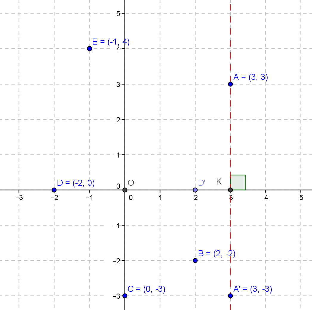Il faut donc tracer la perpendiculaire à l'axe des abscisses passant par A, elle coupe cet axe en un point K, puis avec le compas reporter l'écart KA, de l'autre côté de l'axe, cela donnera le point A'.