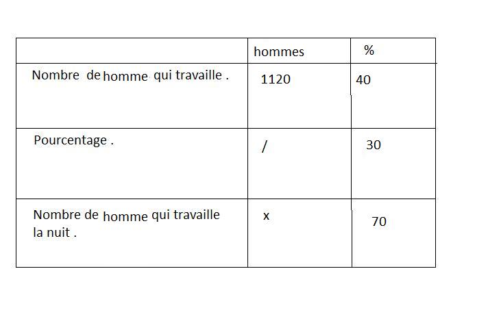 La même chose pour les hommes, je suis d'accord avec 2800-1680=1120, et si le pourcentage d'hommes travaillant la nuit est bien 70%, ton calcul est correct.