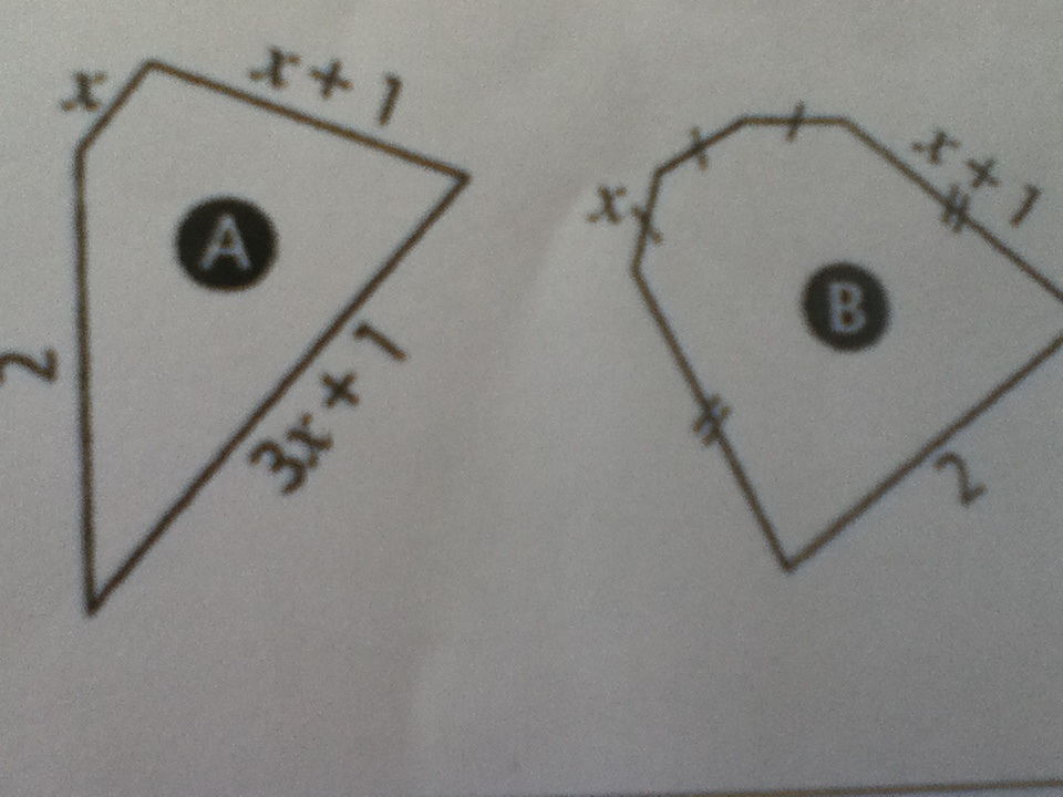 Pour le polygone A, il suffit donc de faire \(\mathcal{P}(A)=2+x+x+1+3x+1\), il faut ensuite réduire cette somme en regroupant les termes en \(x\) ensemble et les nombres seuls ensemble, cela donne \(\mathcal{P}(A)=..x+...\), il faudra ensuite faire la même chose pour le polygone B et tu te rendras compte que les deux expressions seront égales donc les polygones auront le même périmètre.