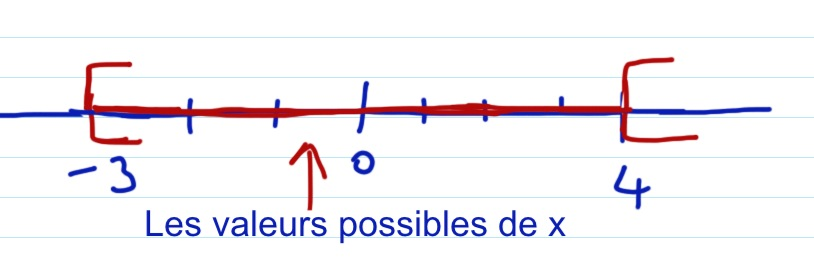 Puis j'ai repassé sur cette droite au stylo rouge la barre symbolisant le -3 jusqu'à la barre du 4 mais cette fois-ci sans la colorier car x est inférieur a 4 donc je me suis arrêtée juste avant cette barre. Le problème c'est que j ai entendu dire que l'on pouvait, lors de ces encadrements, utiliser les crochets sur la droite mais je ne sais pas si c'est exacte et si je dois le faire sur ma droite. Faire donc un crochet de ce sens sur la barre représentant le -3 : [ ,car x est supérieur et égal à -3 et sur la barre du 4 un crochet du même sens [ ,car cette fois ci x est inférieur a 4 mais pas égal à celui-ci. Alors que ci x aurait été inférieur ou égal 4 alors on aurait mit ce crochet : ] , car x pourrait très bien être 4 vu que x est inférieur ou égal a celui-ci.