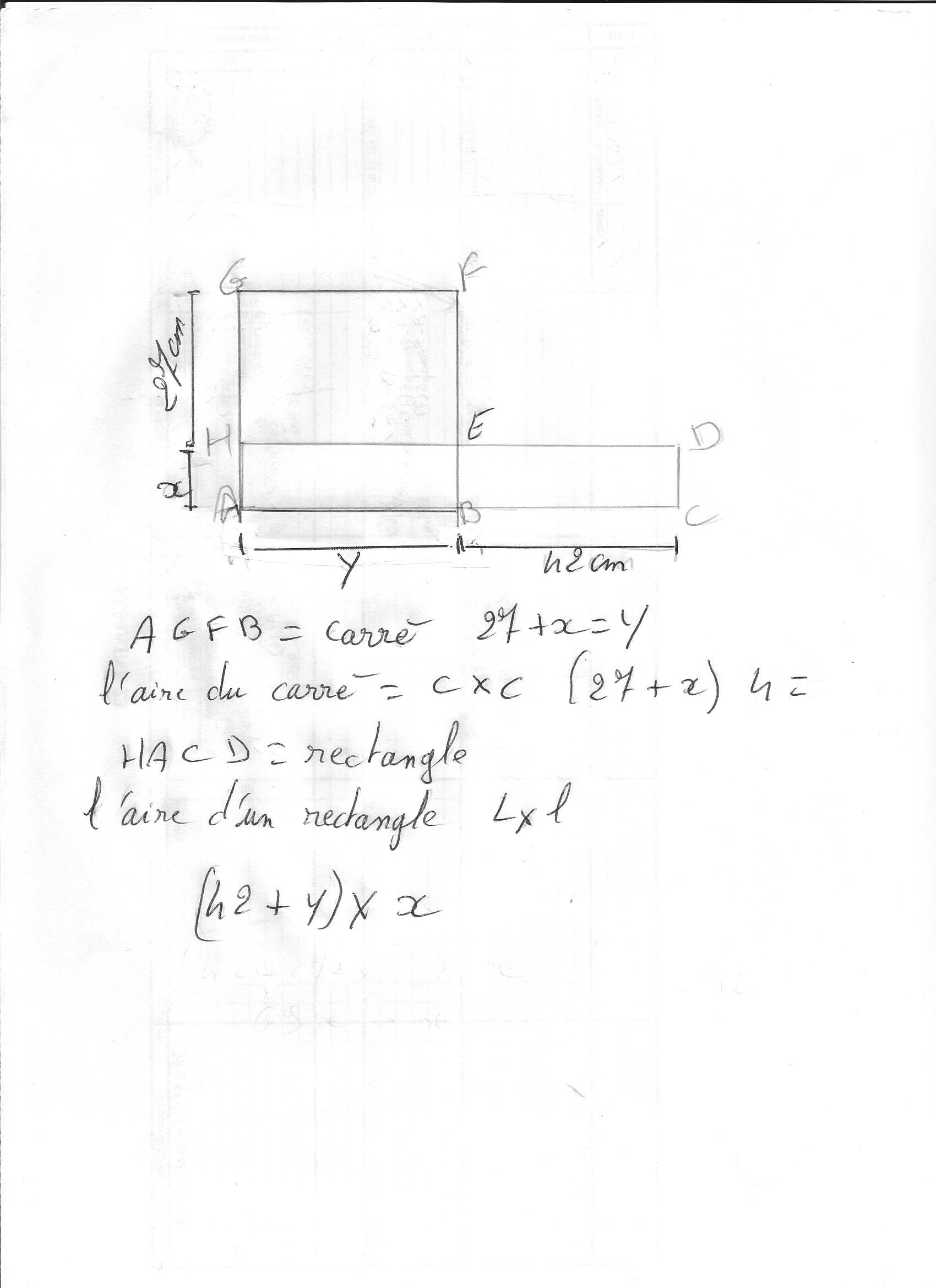 J'ai le meme sujet mais on me demande la valeurs de x pour que l'aire du carré et du rectangle soient egales
