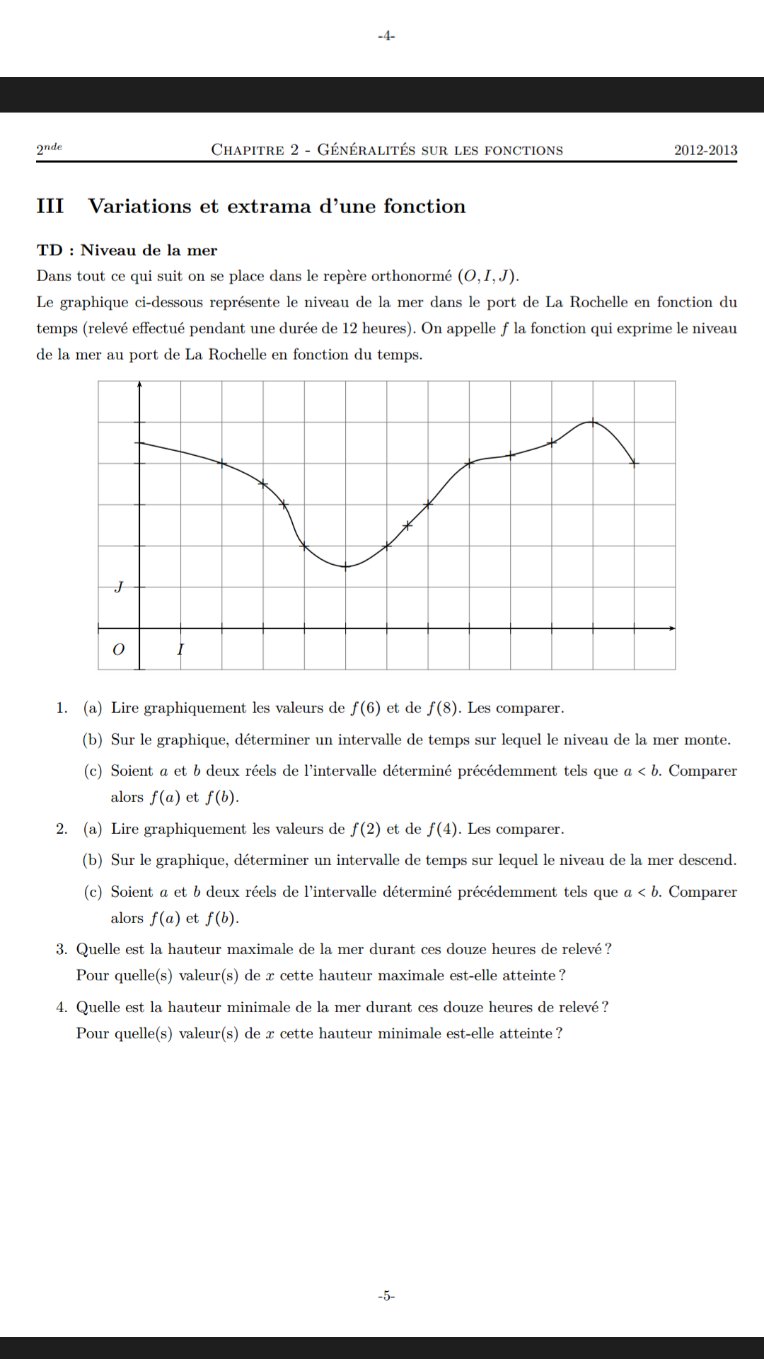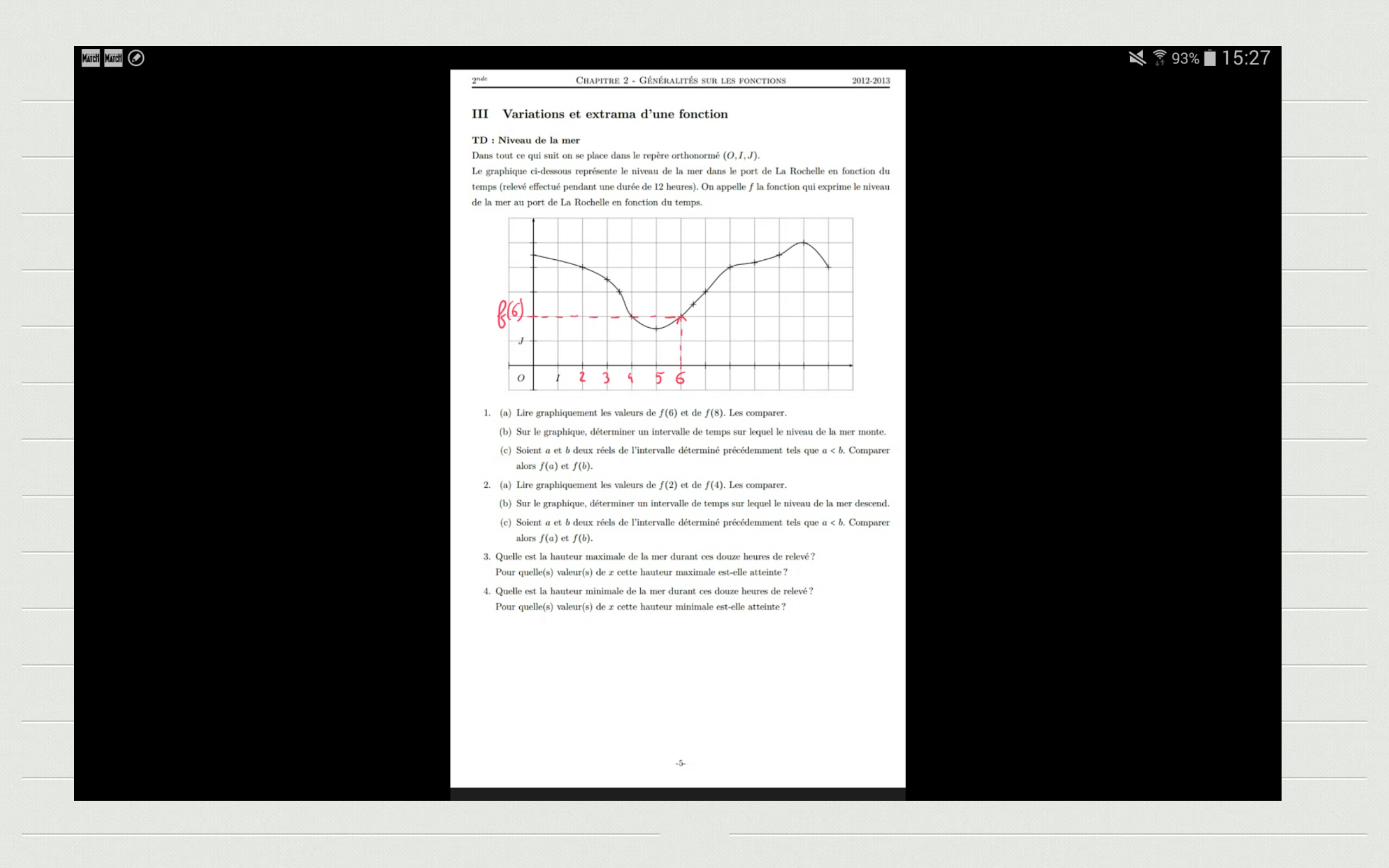 f(6) : il s'agit de traduire les choses. La fonction f donne la hauteur d'eau en m en fonction du temps t en heures.