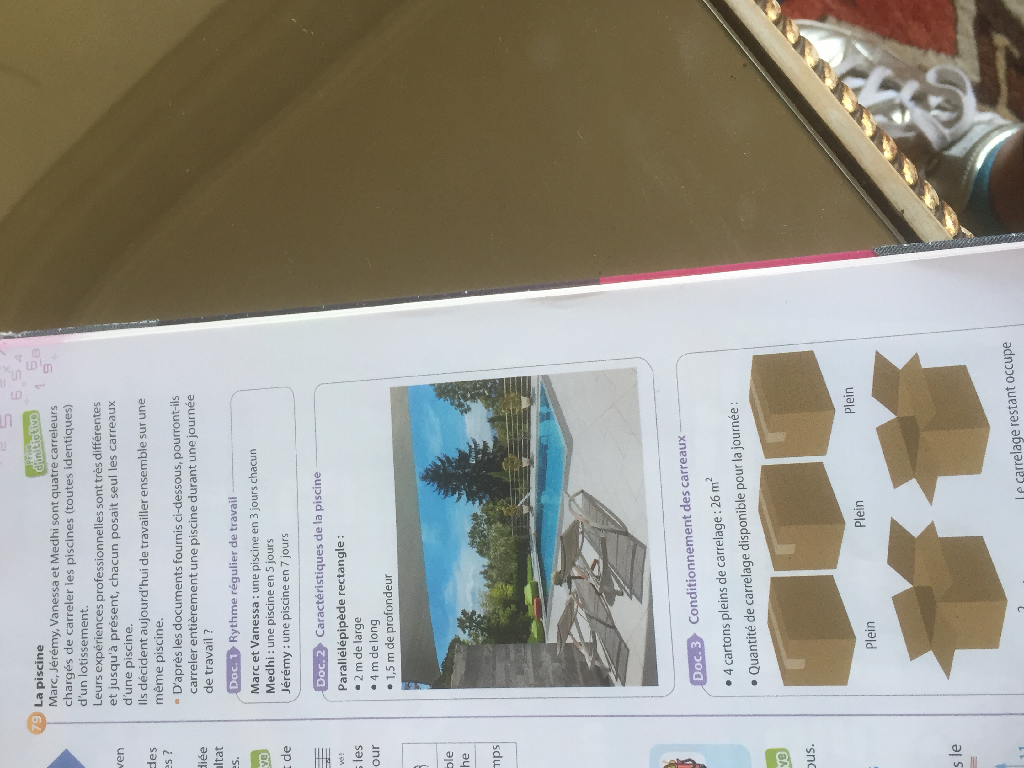 Marc et Vanessa doivent déposer du carrelage sur une piscine de 28 m2 .Sachant que 4 boîtes pleines contiennent 26 m2 et que eux ont trois boîtes pleines de et une boite seulement a 1/3 remplit et une autre a 4/7 remplit . Auront t-il assez de carrelage pour toute la piscine.