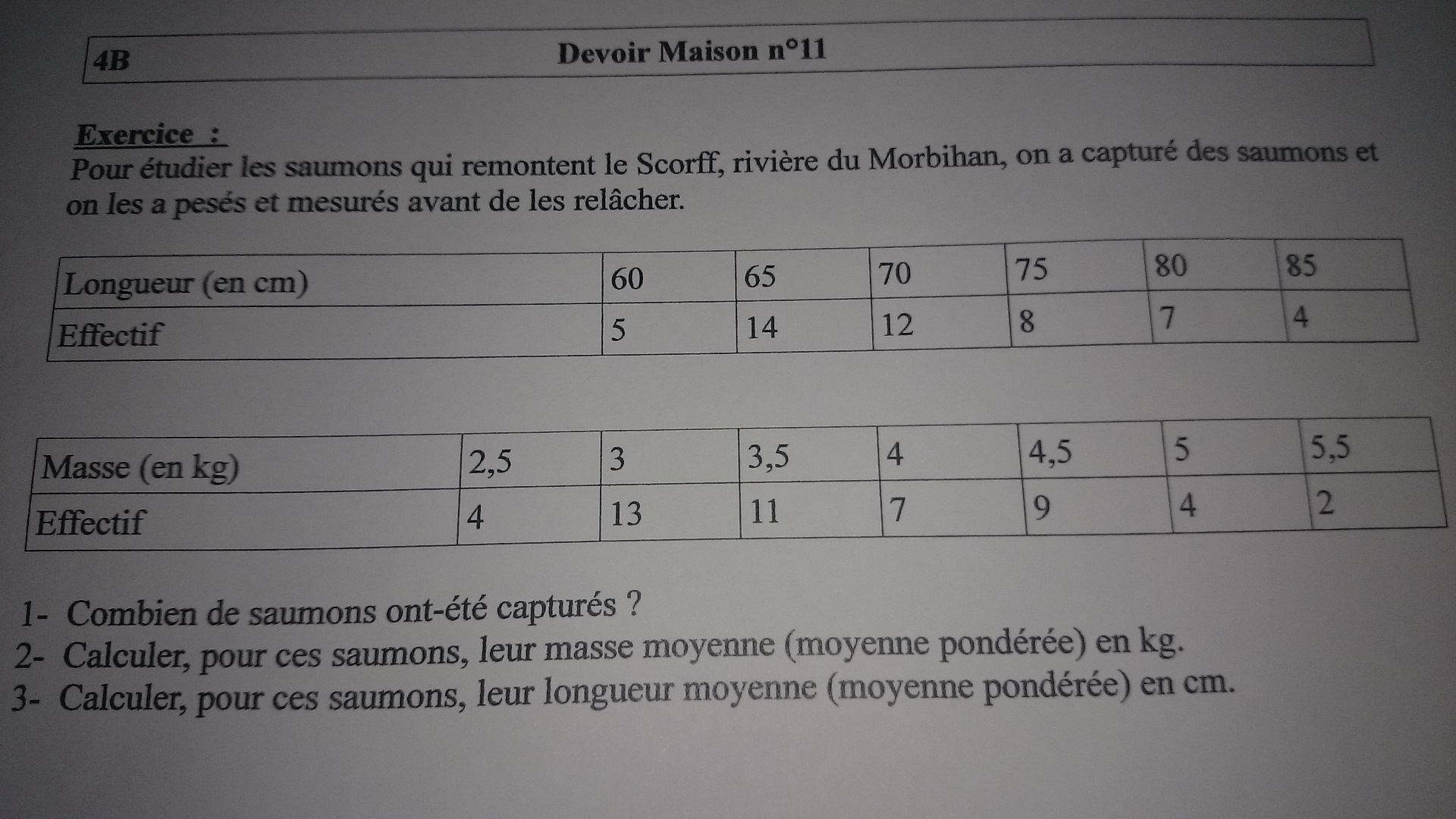 La moyenne est en effet de 3,74kg, ce qui veut dire que si les 50 saumons avaient la même masse, ils pèseraient tous 3,74kg, ce qui n'est bien sûr pas le cas car certains pèsent plus et d'autres moins. C'est l'interprétation de la masse moyenne.