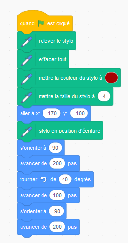 Il faut aussi penser à l'orientation quand tu as tracer les deux premiers côtés, je te conseille de commencer par deux côtés sans cacher le lutin tu verras mieux son orientation