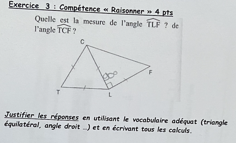 Pour l'angle \( \widehat{TCF}\) il te faut faire de même en remarquant que le triangle \(CLF\) est rectangle isocèle en \(L\), ce qui donne les deux angles à la base égaux à \(45°\)
