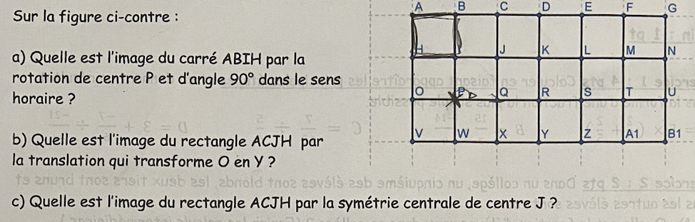 a) La rotation de centre P et d'angle 90° dans le sens horaire fait tourner une figure de 90° dans le sens des aiguilles d'une montre autour du point P.