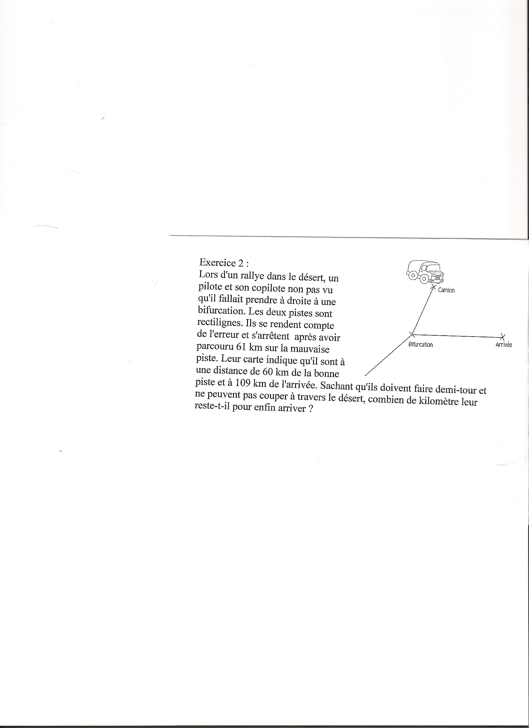 lors d'un rallye dans le desert,un pilote c'est tromper de route ,il se rendent comptent de l'erreur alors qu'ils ont parcouru 61km sur la mauvaise route, la carte indique qu'ils sont a 60 km de la bonne route et à 109 km de l'arrivée ,sachant qu'ils doivent faire demi tour et ne peuvent pas couper a travers le désert combien de kilomètre leur reste t'il pour arriver?
