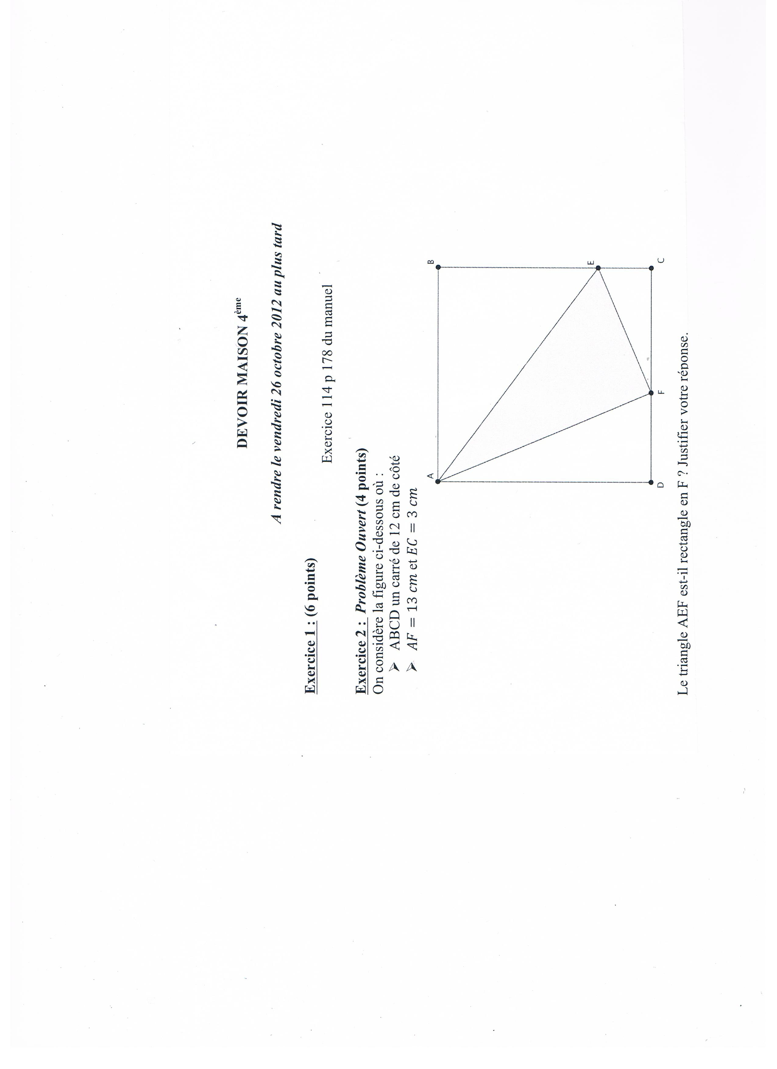 4°) Compare alors le carré de AE avec la somme des carrés des côtés AF et FE, conclus.