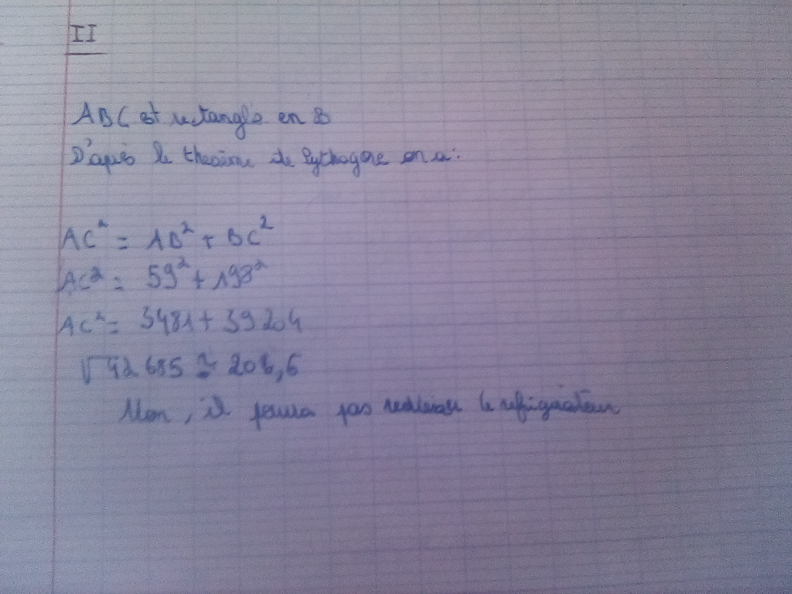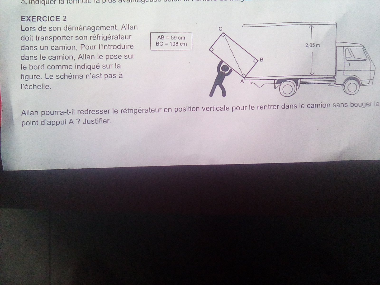 Ensuite tu peux en déduire AC et le comparer à 2m05.