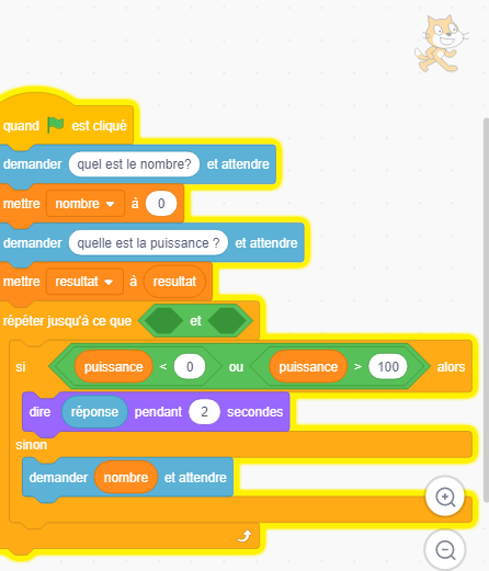 Donc tu auras "répéter jusqu'à ce que puissance >0 et puissance <100". Je te laisse choisir les bonnes briques.