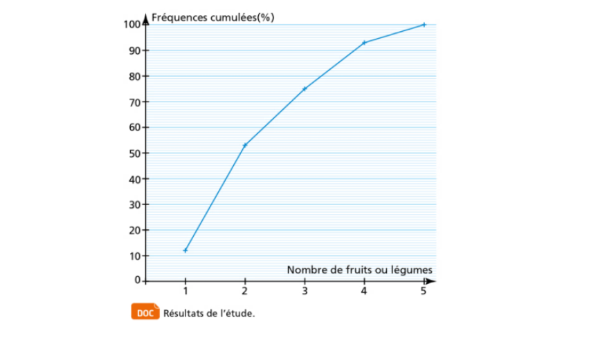 La chaine télévisée « Santé Plus » veut renouveler ses campagnes publicitaires. Elle réalise des études auprès des consommateurs. L’équipe qui s’occupe des différents sondages a posé, à un très grand nombre de personnes, la question suivante : « Combien de fruits ou légumes mangez vous en moyenne par jour ? »