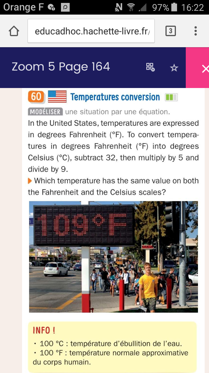 Or tu veux trouver un nombre \(x\) qui correspondent à la même température dans les deux échelles donc il suffit d'égaler les deux expressions, cela te fera une équation d'inconnue \(x\).