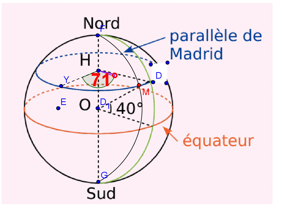 Par exemple New York, représentée par un point Y est à la même latitude que Madrid (donc sur le même parallèle) mais à une longitude de 74° ouest, il y a donc 74-3 degrés d'écart :\(\widehat{MHY}=74-3=71\)