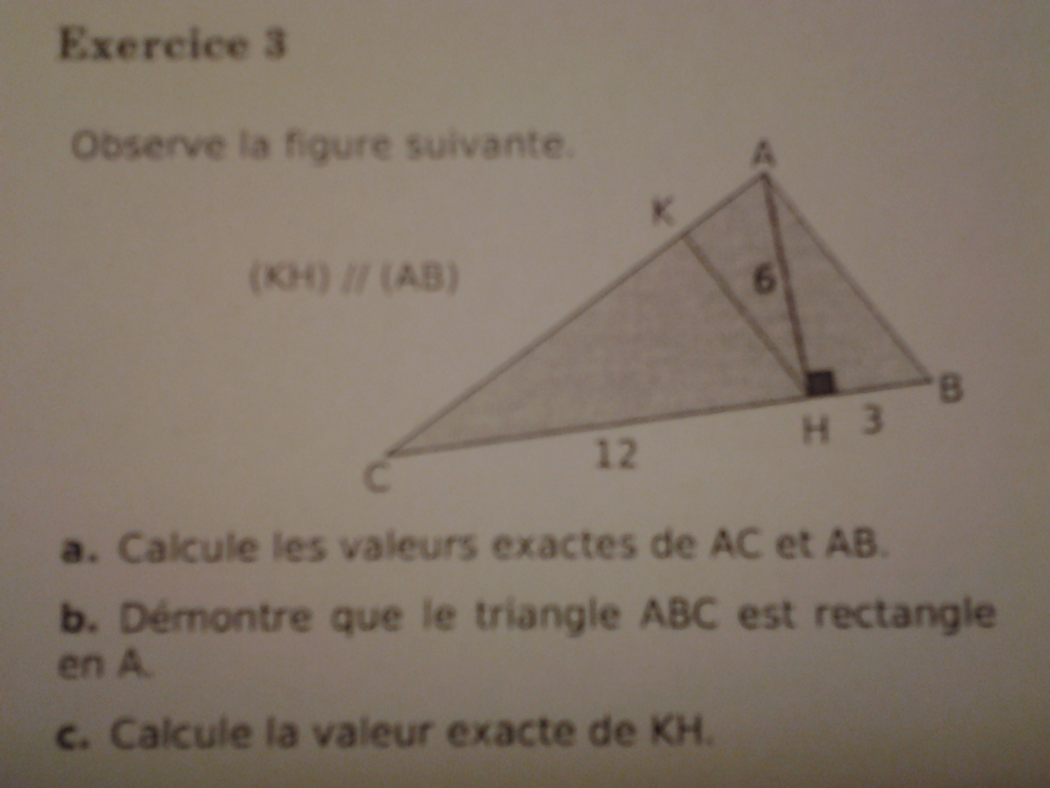 Si ça vous ennuie pas je ne compred pas la question a) d'un autre exerccie. Je sais qu'il faut utiliser le théorème de Thales mais il me manque un longueur pour trouver AC.