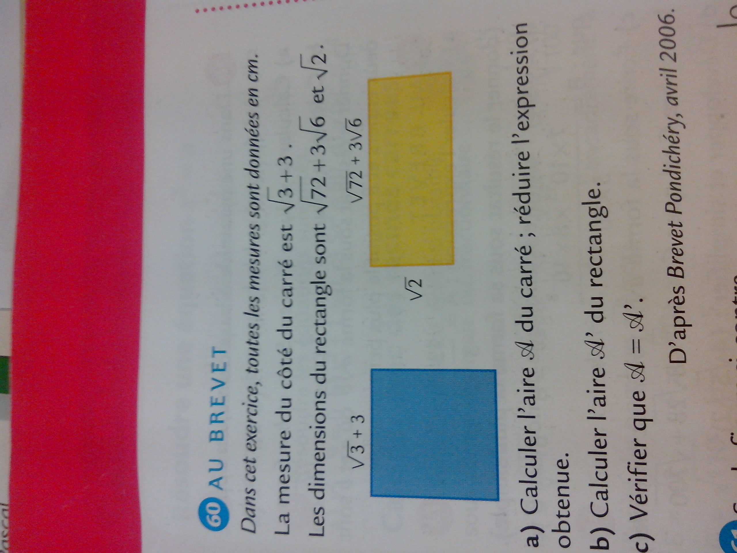 \(\mathcal{A}_{\mbox{carre \,bleu}}=(\sqrt{3}+3)\times (\sqrt{3}+3)=....\)