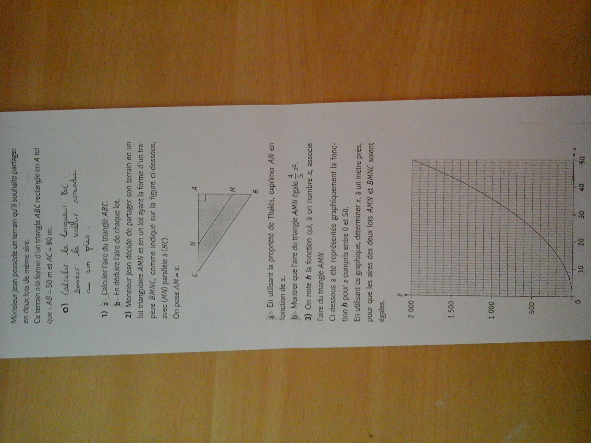 2) Monsieur Jean décide de partager son terrain en un lot triangulaire AMN et en un lot ayant la forme d'un trapèze BMNC, comme indiqué sur la figure ci dessous, avec (MN) parallèle à (BC).