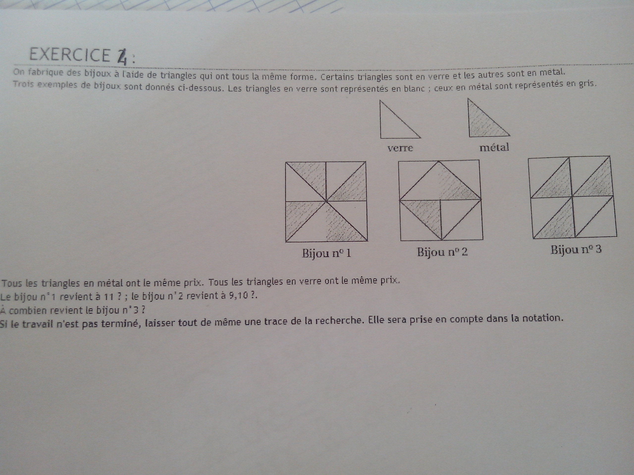 Soit x le prix d'un triangle en verre et y le prix d'un triangle en métal.