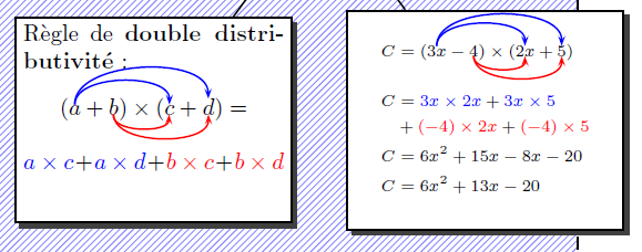 Il faut que tu utilises la double distributivité : Applique cela aux deux produits de ta première expression en faisant attention au signe - devant le deuxième produit.
