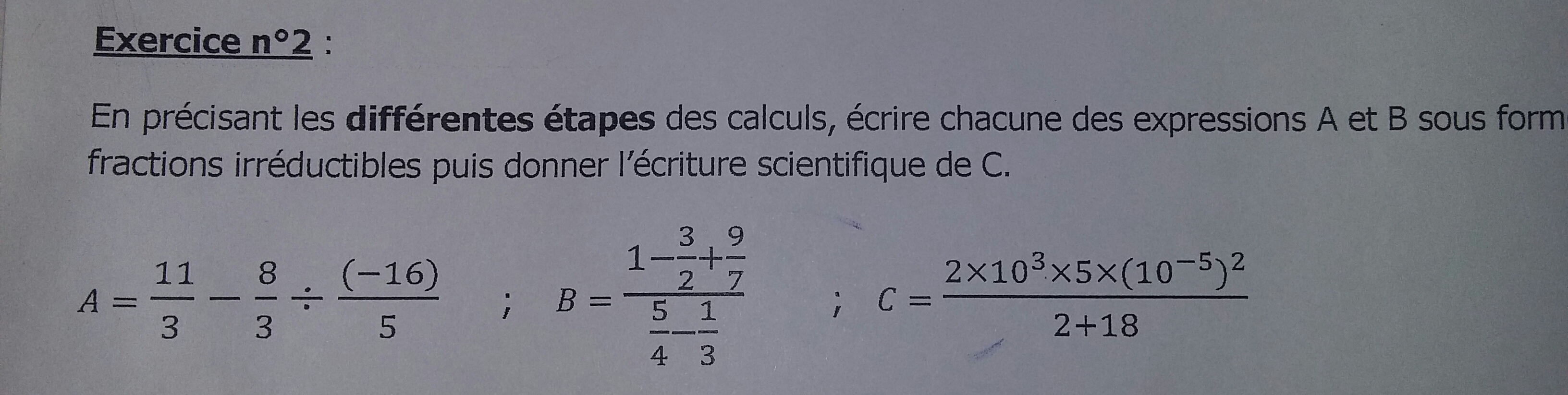 En précisant les étapes de calcul, écrire chacune des expressions A et B sous forme de fractions irréductibles puis donner l'écriture scientifique de C.