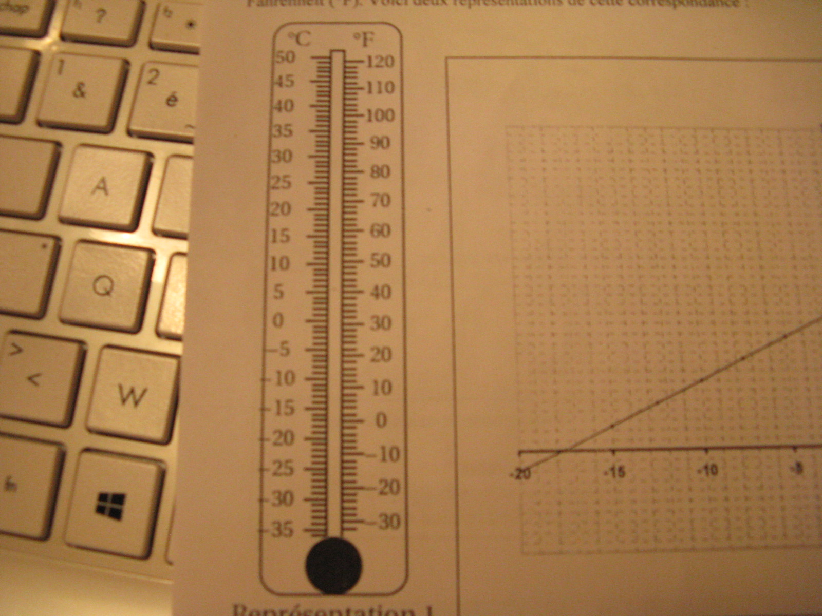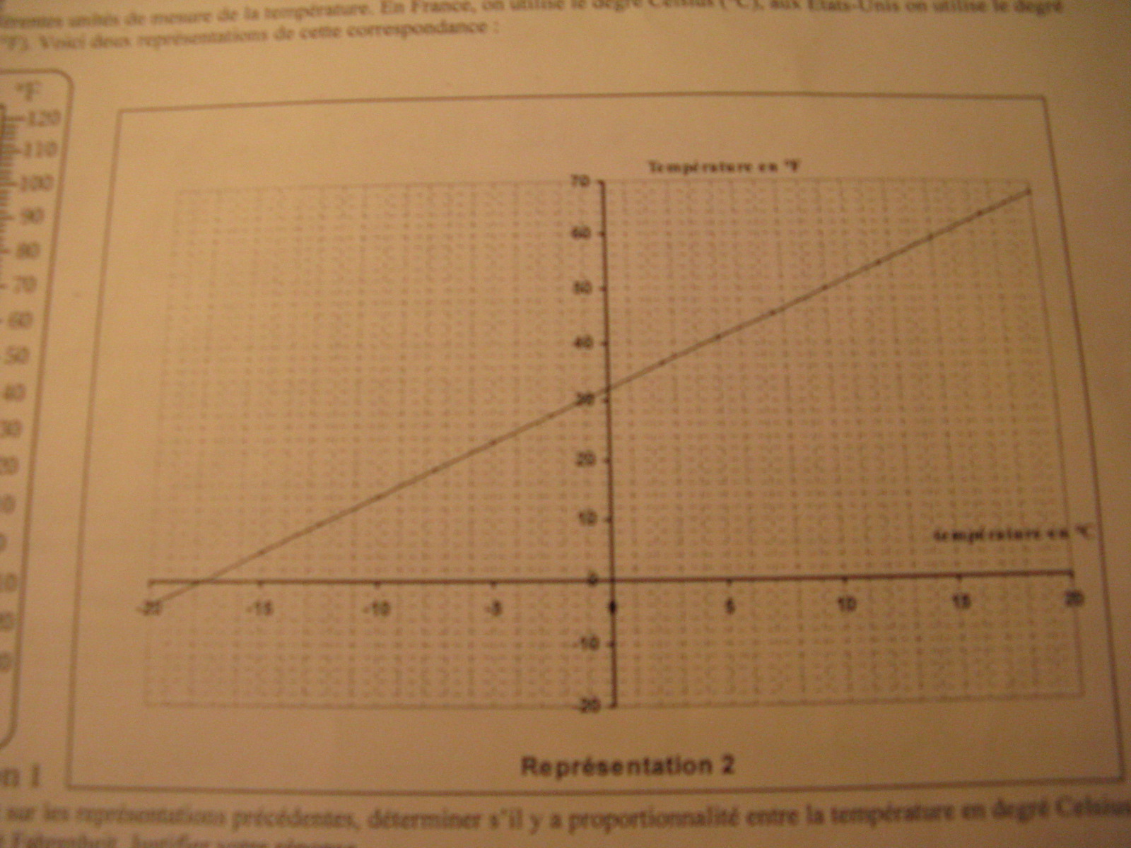 Pour le deuxième exercice, c'est de a proportionnalité. Vous trouverez ci-joint les document photo de l'exercice en question comprenant un graphique avec les températures en degrés Celsius, et les températures en degrés Fahrenheit (degrés américain) et une autre photo qui montre un thermomètre avec aussi les 2 types de degrés.