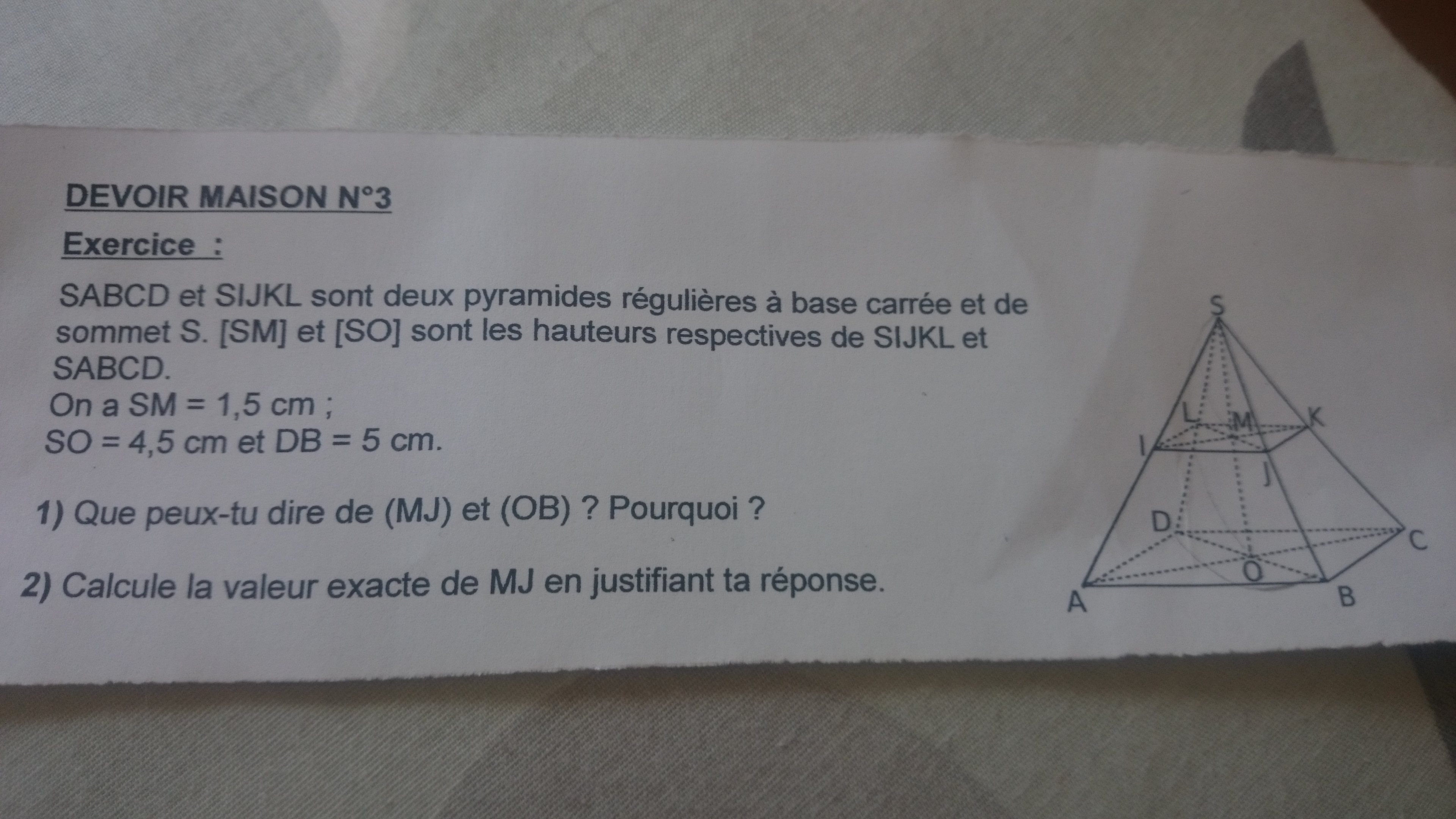 Vous devez avoir comme relation \(\dfrac{SM}{SO}=\dfrac{SJ}{SB}=\dfrac{MJ}{OB}\) en appliquant le théorème de Thalès dans le triangle SOB avec \((MJ}//(OB)\).