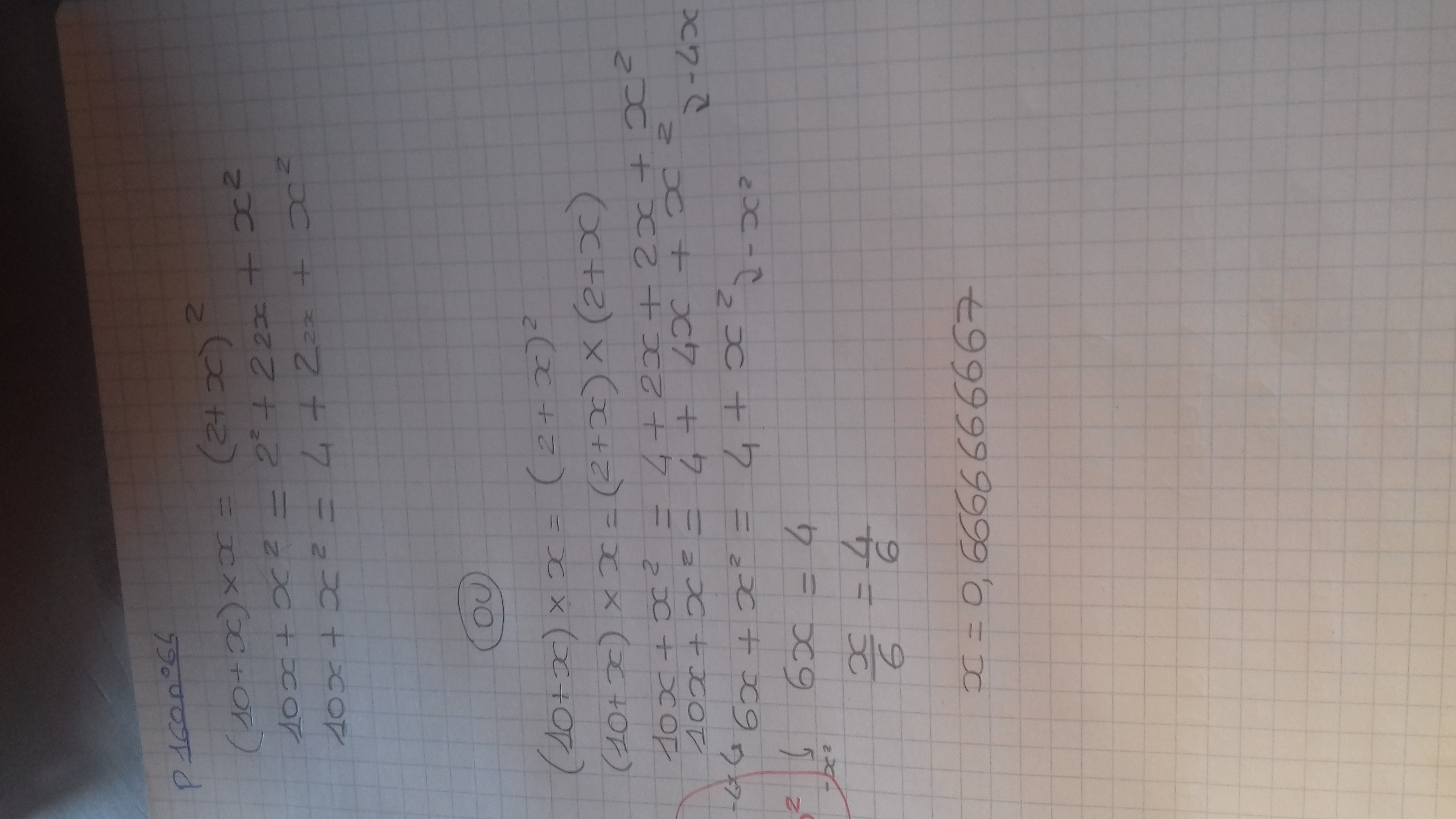 \((2+x)^2\) le développement est à reprendre. C'est la forme \((a+b)^2\) qui donne \(a^2+2ab+b^2\)